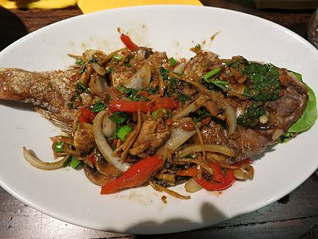 煎魚 bpla jian AU$30.00 (crisp whole snapper in ginger and yellow bean sauce)