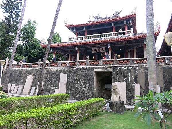 1886年清庭台灣知縣沈受謙為了振興文教,在赤崁樓北側建蓬壺書院(現只剩下門廳),同時將赤崁樓樓基填平,在高臺上建造文昌閣(北面),五子祠(供奉宋儒朱熹,程灝,程頤,張載和周敦頤. 1911年因颱風倒塌)及海神廟(南面).1965年整修將木結構改為鋼筋混凝土建築,也將入口由西改為海神廟的南方.(~~前前後後一大段歷史,我懶得當文抄公就不多介紹了.)