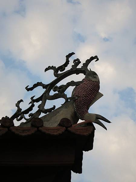 角落的屋簷尾端都有"鯉魚翻躍"藻飾.口吐水波,捲捲外湧,還有噴水防火,保護平安的意思.