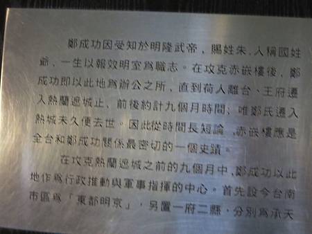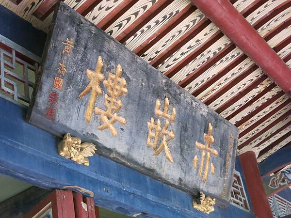 入口懸掛著1966年台灣省主席黃杰題的"赤嵌樓".到底是"崁"? 或是"嵌"? 是個爭議話題. 有興趣的可找張力中"赤嵌原是託聲語,崁字焉能獨出頭?--台南「赤嵌樓」名號平議"一文來看看.不過輸入注音"崁"排在前面,愛偷懶的我就用崁吧.