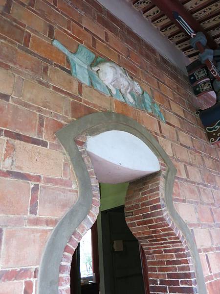 瓶形門上方的蕉葉兔: 牌子上說"瓶門上泥塑『白兔蕉葉』的紋飾,即以蕉葉屬木,象徵東方,白兔代表月亮,象徵『玉兔東昇』吉祥如意".網路上有人解釋為招(蕉的諧音)子,招豐收之意.