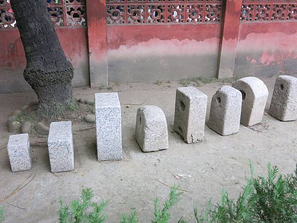 小碑林靠外牆處有一排石頭.技勇石:無貫穿,清朝武生考試時的舉重啞鈴.石駝:有貫穿,昔日商用來秤重的秤錘.
