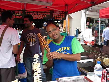 開始逛攤位.原只想照旋風薯片,這位可愛老弟自己拿起一串薯片擺起pose!! 也只好幫他照.