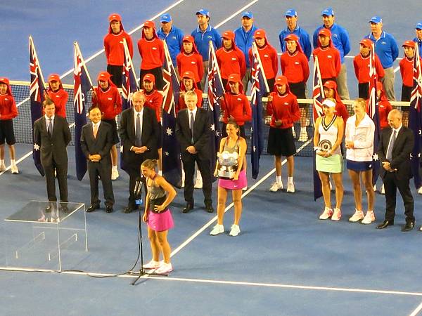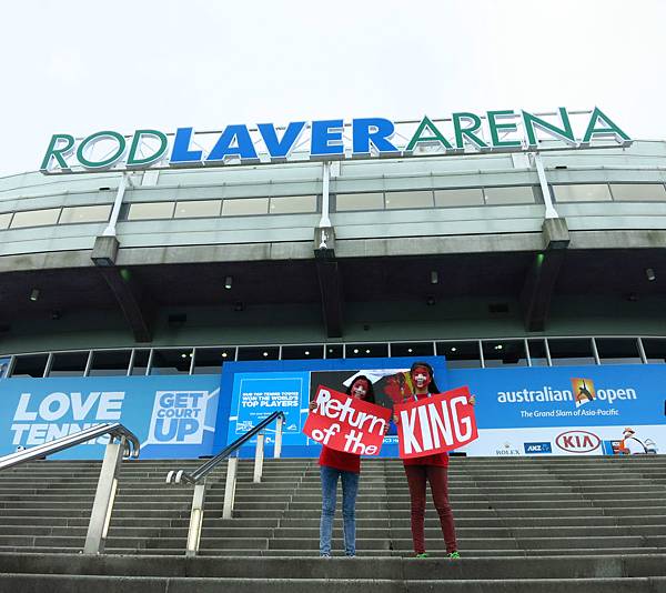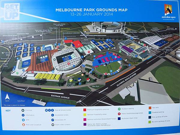 持澳網門票者可免費搭電車前往會場.進去時要檢查包包.主要比賽在 Rod Laver Arena 舉行 (中間偏左白色那棟).