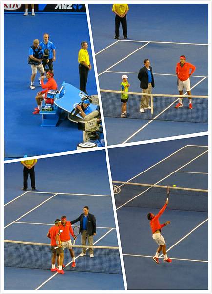費德勒一進場他的fans熱烈歡呼十分high ~~包括我右邊的兩個女孩和後面,不過坐我左邊兩個和前面兩個是納達爾fans,被夾在中間的我感覺很微妙. 我的小類單照不清楚,就請大家隨便看. 正式比賽前: