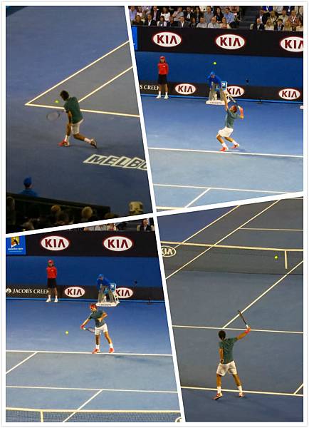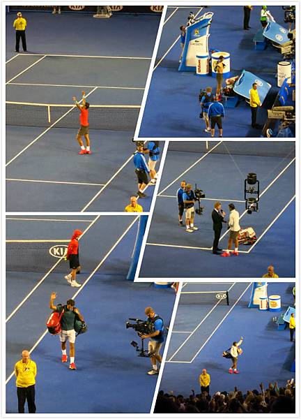 納達爾多數將球送往費德勒的反拍,在你來我往的拉鋸戰中費德勒反拍失誤連連.雖然fans有努力的替他加油,他本人有太大壓力吧? 結果被納達爾以七比六,六比三,六比三擊敗.這場球賽這麼快結束,令人有些失望耶.~~電車司機還戲稱12點來接我們回市區呢.納達爾真是費德勒的剋星...p.s.費德勒在賽後抱怨納達爾的叫聲和拖延時間.