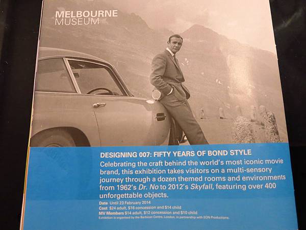 第一站到墨爾本博物館 Melbourne Museum 看流金五十年:007電影設計展 Designing 007: Fifty Years of Bond Style. 場內展出400多件007歷史上的服裝,産品設計,汽車(模型),特效,相關圖片/照片,視覺設計,場景,道具,武器等讓人大開眼界.