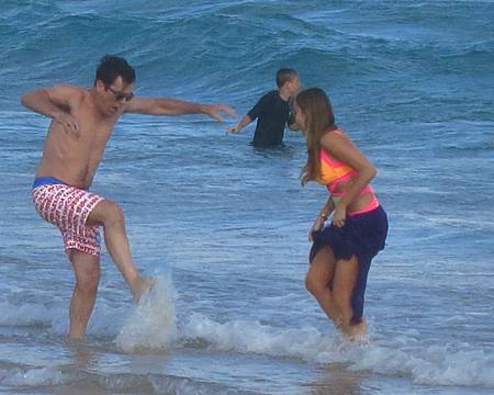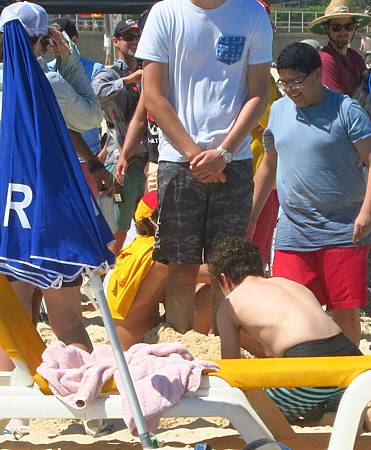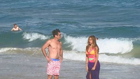 觀眾會以為這位是上空 (彩排時用nubra,開拍時用胸貼). p.s.另有一段Luke和Manny走在沙灘,有兩位上空(有胸貼)女郎迎面而來.~~這段不准拍照.