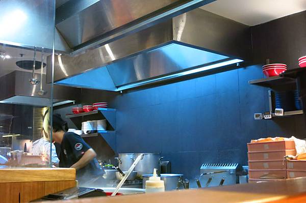坐在出麵地方的旁邊,能看見廚房一部分.一人負責煮麵,加湯.一人負責加配料.
