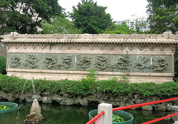 "九龍壁乃按照中國北京北海公園的實物仿製,石刻九龍,戲珠於波濤雲霧之中,蟠踞於花苑之上,栩栩如生。石壁背後刻有由已故中國佛教協會主席趙樸初先生獻寫的「九龍壁」三字及題詩一首。"來源:官網