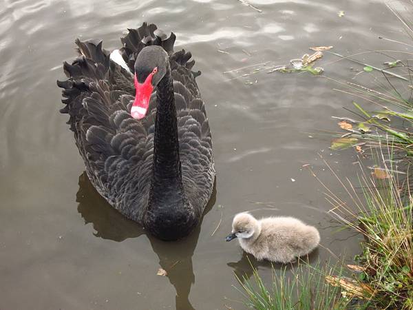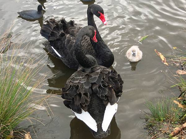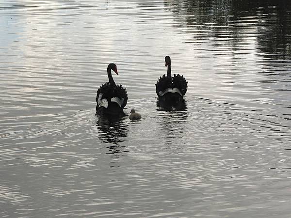 人們喜歡帶麵包來餵鴨子天鵝.剛好有人在餵讓我拍到黑天鵝家族.