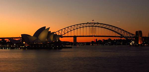 由 Mrs Macquarie's Chair 拍雪梨歌劇院和雪梨大橋.~~利用白平衡功能將天色變成橙色.