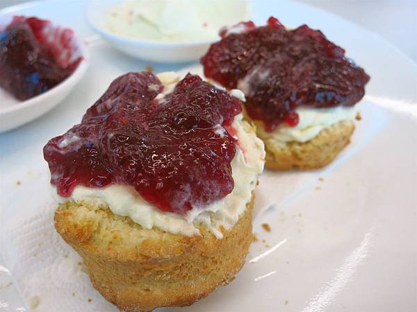 "英式奶油茶点(Cream tea、Devonshire tea 或 Cornish cream tea)是一种典型的英国点心,源自于英国德文郡。其历史存有争议性,但基本上可追溯至十一世纪。英式奶油茶点在英国甚至于其他英语系国家(如澳大利亚、新西兰等)非常地普遍。一般的茶室、咖啡座和餐厅通常都有贩售,作为日间小食或餐后甜点。英式奶油茶点主要包括:英式红茶(English Tea); 司康餅 (Scone); 康沃尔式凝块奶油(Cornish clotted cream); 果酱" 來源:維基百科p.s.雖然維基說是用clotted cream,不過目前為止我都只吃過鮮奶油.