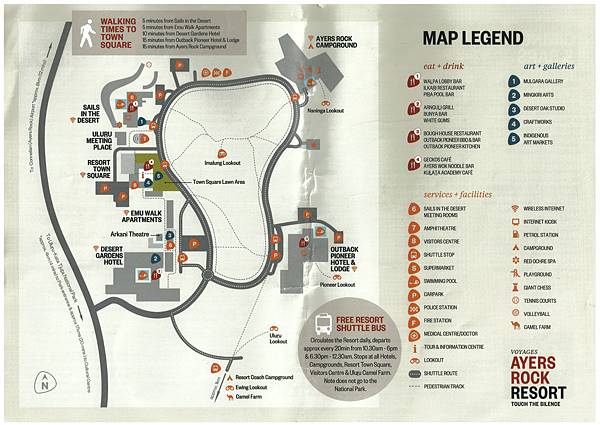 Ayers Rock Resort 有各種不同等級住宿可選擇,從AU$36露營地,AU$38宿舍通鋪到AU$2,400一晚的Longitude 131°.有免費巡迴巴士(10:30am-6pm; 6:30pm-12:30am)~~其實步行也可以.