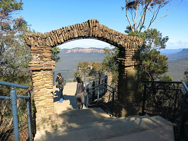 穿過Echo Point Information Centre旁的石拱門,就是最近重新開放的Three Sisters walking track.路面平坦推輪椅也可以,展望台也加寬了.然後來到第二個石拱門.