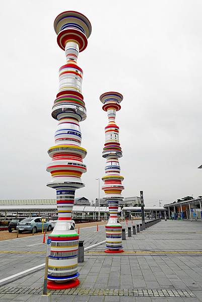 "聳立在高松港,高達8公尺的兩根柱子。色彩豔麗的部分為鏡子表面,反照周遭港口及大海、建築物等風景,依欣賞位置或時段等不同狀況呈現多樣風情。在將高松環境圖像化的同時,也清晰反照出鑑賞者的面貌。" 官網