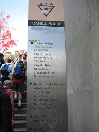 坐火車到 Milsons Point 一出火車站向左走不用過馬路即可看見通往雪梨大橋的階梯. ~~ 這個火車站就在大橋的延伸部分, 幹嘛走到對面?